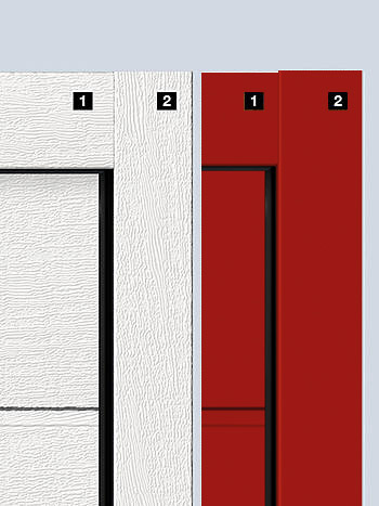 Die Seitenzargen [2] erhalten Sie serienmäßig in weißer Woodgrain Oberfläche. Auch für farbige Sektionaltore und Tore mit Decograin Oberflächen erhalten Sie optional passende Zargenverkleidungen [2] in der Oberfläche und Farbe bzw. dem Dekor der Torlamellen. Die Sturzausgleichsblende [1] wird bei diesen Toren immer in der Oberfläche und Farbe bzw. Dekor der Torlamelle geliefert.