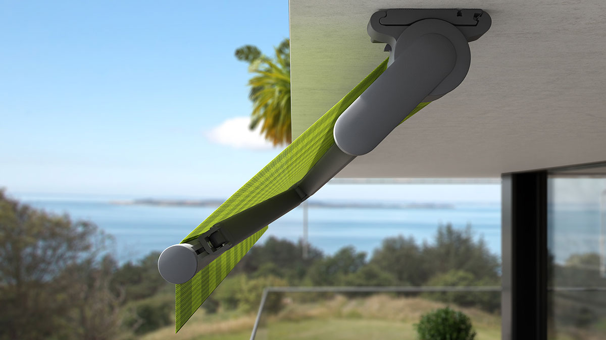 Erste Klemmmarkise mit Gelenkarmtechnik und Bionic-Sehne