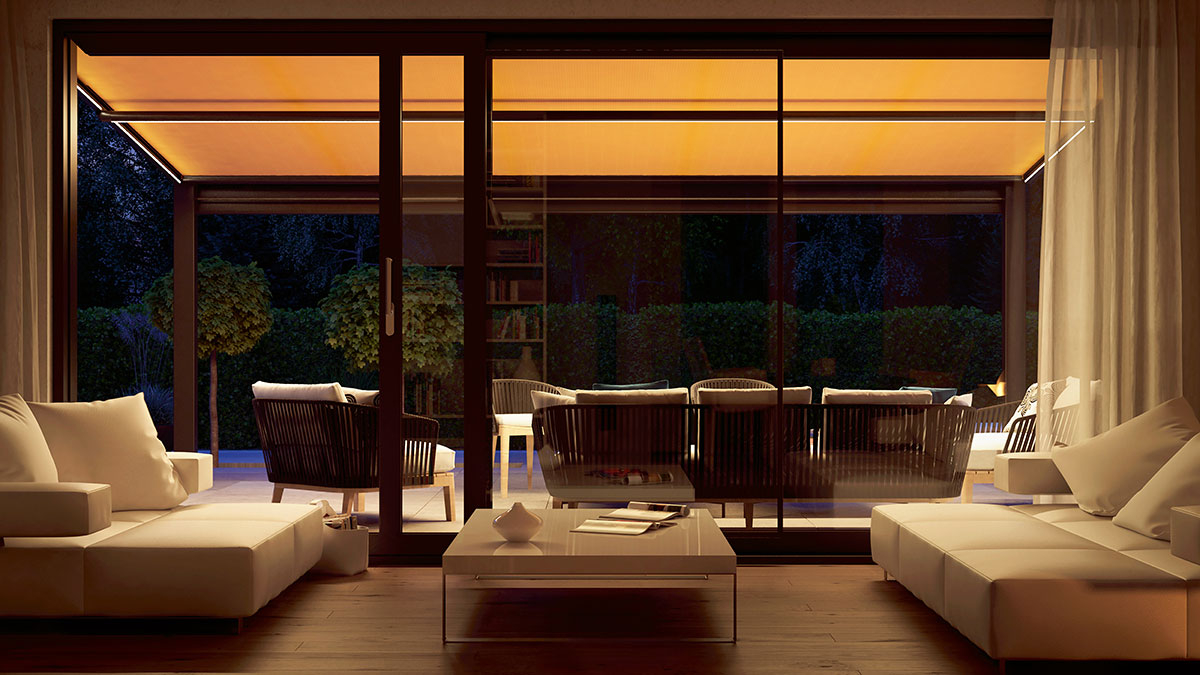Die markilux 679 vereint elegant klare Linienführung mit dem Terrassendach und schafft eine harmonische Einheit. Sie ist nicht nur eine Lichtquelle für die überdachte Terrasse, sondern auch eine Bereicherung für das Leben im Freien. Tagsüber dient sie als zuverlässiger Sonnenschutz und am Abend präsentiert sie sich in vollem Glanz. Die farbigen oder warmweißen LED-Lines sind nahtlos in die Kassette und die Führungsschienen integriert und lassen sich intuitiv per App steuern.