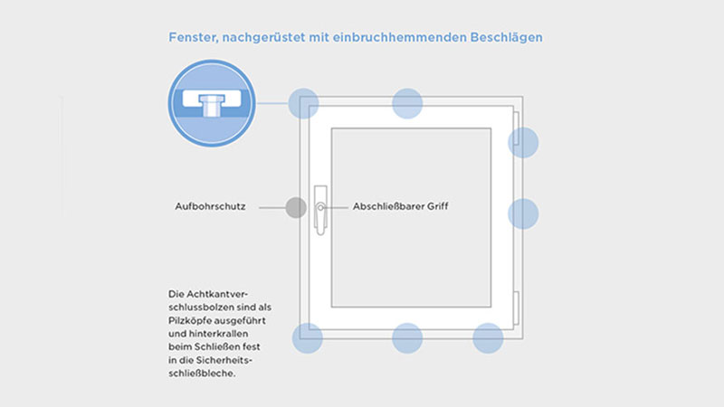 Ihre hohe Einbruchhemmung erreichen Winkhaus Beschläge durch die Verwendung von Pilzkopf-Verriegelungen, die rundum im Fenster angebracht werden. Alle sicherheitsrelevanten Teile sind aus hartem Stahl gefertigt, dazu zählen neben den Pilzköpfen auch die Sicherheitsschließbleche.